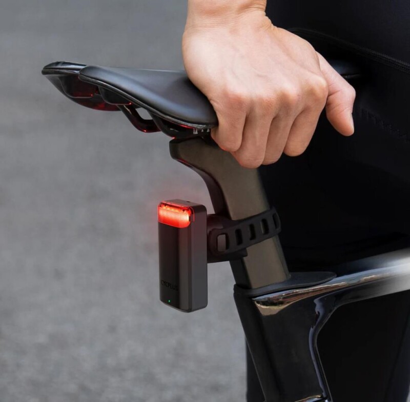Cycplus L7 Radar Arka Lambası bisiklet lambası, sele direğine takılı ve açılıp kapandığını gösteriyor