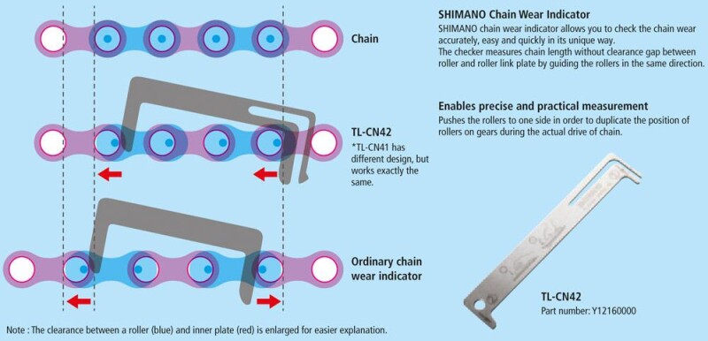 Shimano TL-CN42 Zincir ölçüm aleti her zaman doğru sonucu görüntüler.Aşınmış zincir vites ve pinyonların ömrünü kısaltır.Zayıf kaymayı ve düzensiz sürüş aşınmasını azaltmak için üreticiler arka dişli değişiminden önce zincir değiştirilmesini tavsiye eder. Çoğu üretici zincir değiştirme değerlerini ayrı verebilir. Shimano TL-CN42 zincir anahtarı sayesinde artık herhangi bir zincirin aşınmasını ve gerginliğini hızlı ve doğru bir şekilde belirleyebilirsiniz. Shimano TL-CN42 zincir kontrol ünitesinin kancalı ucunu zincir pimine takın diğer uc zincir pimine girmez ise zinciriniz uzamamıştır,eğer diğer uc zincir pimine cok kolay girerse zincirinizin ömrü bitmiştir zinciriniz olması gerekenden daha fazla uzamış olup gurubunuzdaki diğer elemanlara zarar vermeye başlayacaktır. eger diğer uca giriş kolay değilde braz sıkı bir şekilde girerse zincırızın biraz daha kullanım ömrü var demektir.